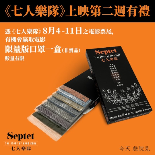 如斯的口罩,當然也是限量供應。觀眾需要憑《七人樂隊》於八月四日至八月十一日的任何票價門票的票尾,然後到寰亞電影的官方Facebook專,並按照指示參加。而有關的禮品得獎名額為一百名,並且以先到先得的方式送有關禮品。希望獲得有關禮品的觀眾,也許需要把握機會參與好了。
