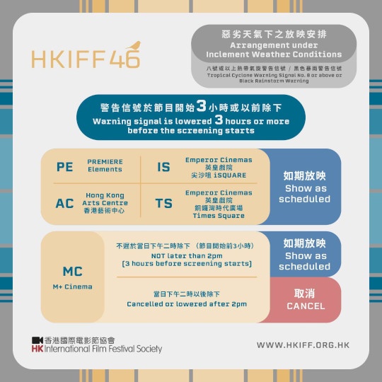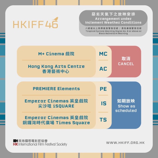 今年香港國際電影節於兩組場地放映,當中於香港藝術中心與M+戲院在八號以上熱帶氣旋警告信號與黑色暴雨信號發出時將取消放映,觀眾可以安排退款。而位於商營戲院,包括兩間英皇戲院及Premiere Elements的場次將如期放映。然而倘若未能前放場地,亦可申請退款。