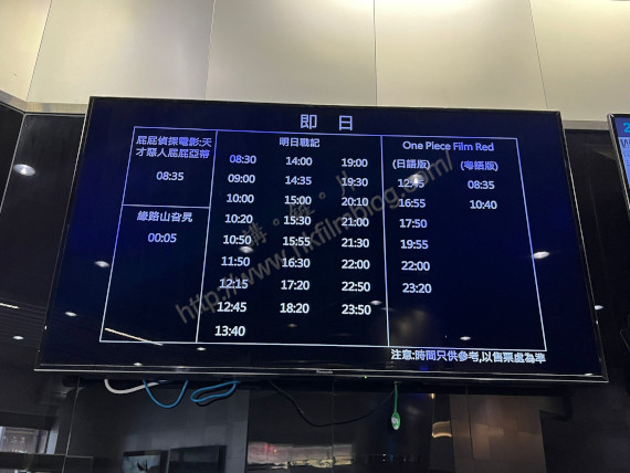 上圖所見,便是今天巴倫紐的放映場次,全日四個影廳合共放映三十四場,當中除了新映發行的《One Piece Film Red》放映六場日語版及兩場粵語版,而洲立與指令發行的《屁屁偵探》只映早上八時三十五分早場,而高先發行、黃浩然執導的《緣路山旮旯》則只映零時零五分的午夜場。至於其他廿五場,則屬於天下一出品兼發行、古天樂總監製、吳炫輝執導的《明日戰記》。