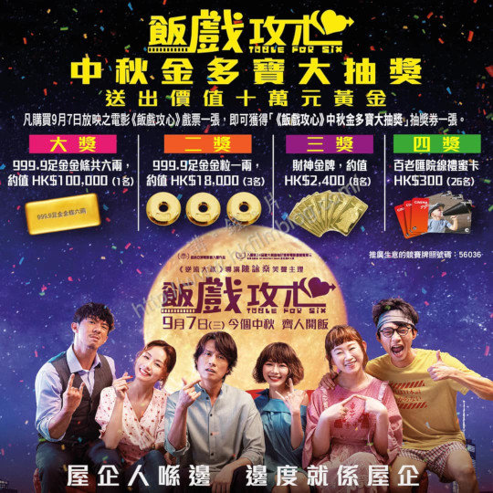 上圖所見,便是來自安樂發行在Facebook專頁的圖片,《飯戲攻心》將會舉行中秋金多寶大抽獎,觀眾凡購買九月七日開畫日電影《飯戲攻心》戲票一張,即可獲得《飯戲攻心》中秋金多寶大抽獎抽獎券一張。