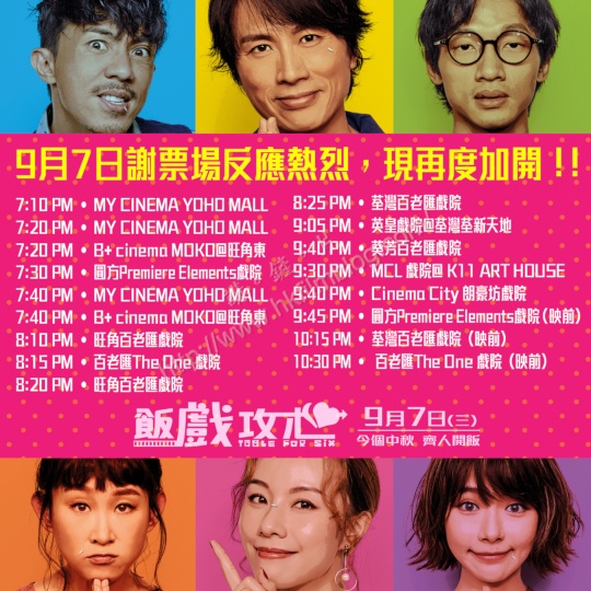 上圖所見,便是《飯戲攻心》首天謝票場次,再加開謝票場次後,合共提供十七場謝票。觀乎部分場次幾乎是同時在映後謝票,相信謝票團隊需要分為數組於不同戲院可以幾乎同時謝票。而謝票場次全屬於晚上七時後的夜場。