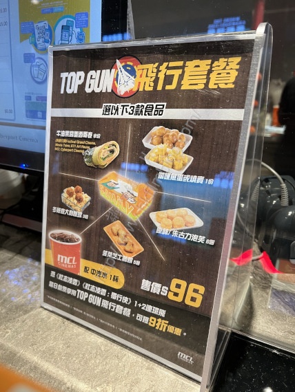 上圖所見,便是「講。鏟。片」情報人員於中秋節期間在MCL數碼港戲院小食部所攝,可以看到該戲院推出「Top Gun飛行套餐」,可以這款套餐其實並沒有任何關乎電影《壯志凌雲》系列的禮品送上,只是該戲院平常也會推出的家庭套餐,三款食品配上一杯中汽水承惠九十六元。