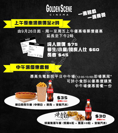 上圖所見,便是高先電影院本周起推出的優惠。當中周一至周五上午優惠場票價優惠將延長至下午二時,成人票價為75元,較成人正價100元的票價提供近七五折優惠。