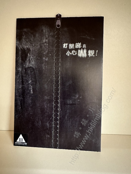 上圖所見,便是一部電影優先場的戲票,戲票正面只寫上「打開睇真,小心嚇親!」八字,左下方還有三級標誌,還有一條設計成拉鏈式的封條,看起來似乎打開有點令人感到恐怖似的,而觀眾可以拉下這條「拉鏈」來看過究竟。