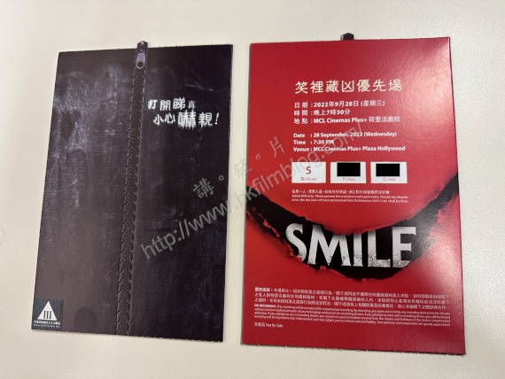 上圖的戲票,其實是洲立發行、於今天開畫的派拉蒙恐怖電影《魅笑》於今天上映,並於昨晚舉行「笑裡藏凶優先場」,而上圖所見則是該優先場的戲票。觀乎電影的設計,完全配合了電影的主題。未知大家收到如斯戲票時,又敢開這條「拉鏈」麼?
