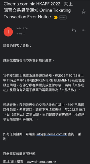 上圖所見,便是百老匯院線於昨天向部分購買了香港亞洲電影節門票的觀眾發出電郵的內容,當中指出在十月二日上午十一時至中午十二時期間於九龍站Premiere Elements的系統曾發售問題,部分觀眾在購票完成及付款後,卻將原本應是「交易成功」及發行有效電子戲票的交昆的,錯誤地發出「交易失敗」的電子郵件。
