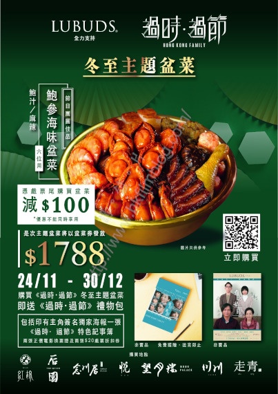上圖所見,便是電影《過時.過節》推出的冬至主題盆菜,以鮑參海味盆菜的形式提供,可借六位使用,並且提供鮑汁與麻辣兩種口味。主題盆菜以盆菜券形式發售,每券售價為1,788元,而憑該電影票尾購買盆菜可獲一百元優惠。而購買這款主題盆菜,可獲《過時.過節》禮物包,包括印有主角簽名獨海報一張及《過時.過節》特色記事簿一本,同時獲兩張電影《過時.過節》正價換票證及兩張二十元戲票折扣券。