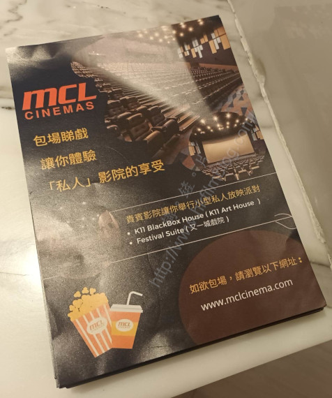 上圖所見,便是「講。鏟。片」情報人員日前於MCL院線其中一間戲院取得的單張,當中便是宣傳MCL院線的包場宣傳,當中榜標「私人影院的享受」,同時指貴賓影院亦可讓觀眾舉行小型私人放映派對。而舉行戲包括九龍塘Festival Grand Cinema的Festival Suite,以及位於尖東站K11 Art House的K11 Black Box House。