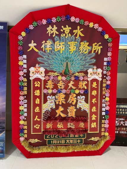 花牌以黃子華在片中的林涼水大律師事務所為名,中間寫上「《毒舌大狀》票房大賣」新張誌慶,對聯用上宣傳句語「是非不在金銀,公道自在人心」的句語,下方則寫2023農曆新年1月21日大年三十的字眼,看來宣傳品雖然沒有任何演員的相片,但仍算是奏效吧!