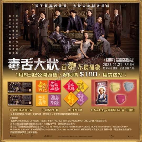 《毒舌大狀》「百毒不侵福袋」每套「發財價」188元,限售一千套,將於一月六日起在太古城MOViE MOViE Cityplaza、荃灣百老匯、觀塘b+ cinema apm及元朗My Cinema Yoho Mall開始發售。有意購買福袋的觀眾,也許需要留意各售賣戲院的營業時間好了。
