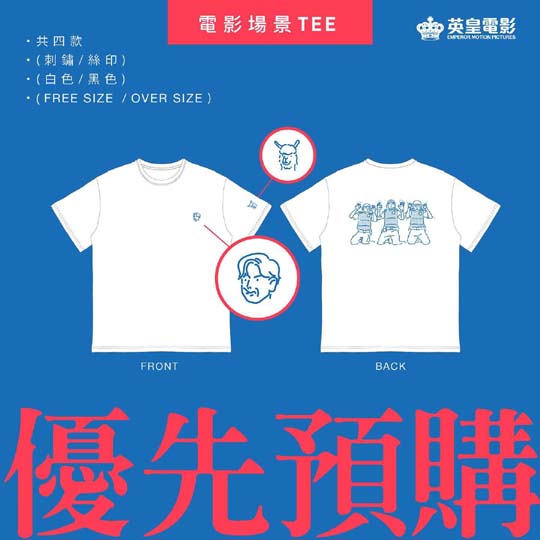 另一款電影精品為電影場景T恤,共有四款款式,當中包括了黑色、白色以及刺鏽與絲印,而且正面與背面均印有圖案。
