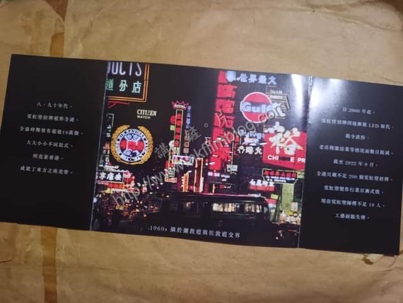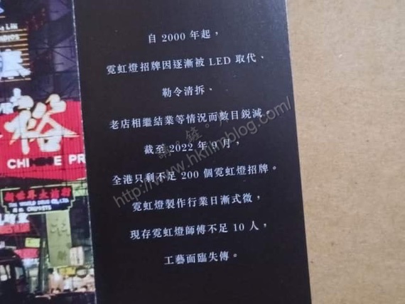 左方的文字,先介紹全港於八、九十年代曾有超過十萬個大小不一的霓虹光管招牌。
