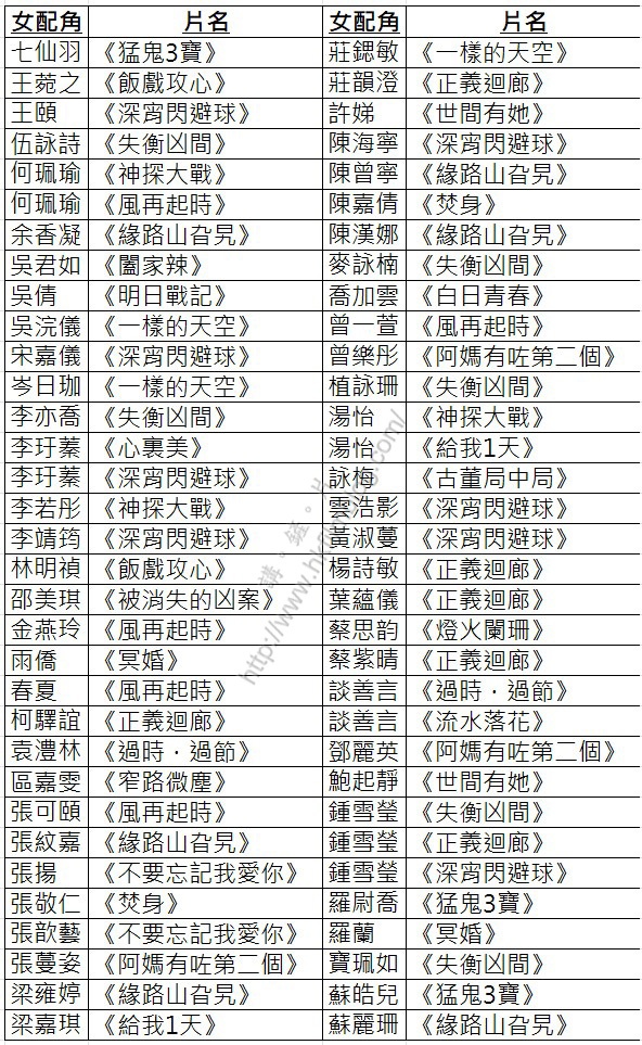 個人提名方面,今年可以說是鍾雪瑩一枝獨秀,分別慼《失衡凶間》、《正義迴廊》與《深宵閃避球》報名最佳女配角。而提供兩部電影選擇的女配角亦有四位,分別為何珮瑜、李玗蓁、湯怡與談善言。