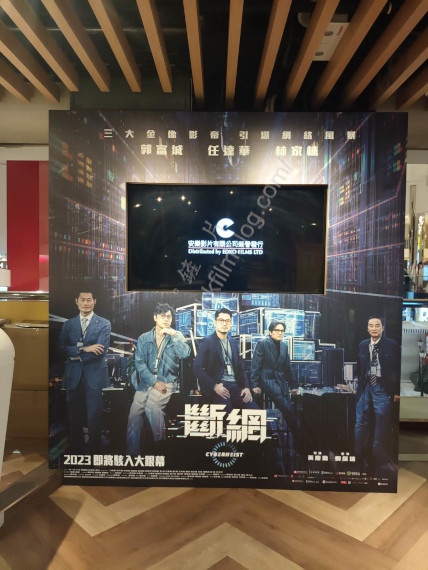 上圖所見,便是「講。鏟。片」情報人員日前於太古城中心MOViE MOViE Cityplaza戲院所攝,可以看到在售票處與自助售票機中間的戲院大堂位置,已擺放了電影《斷網》的宣傳,當中宣傳品包括大型電視屏幕,以滾筒式播放預告,上方寫上「三大金像影帝,引爆網絡風暴」為主題。而下方則出現五位男角,從左至右分別為黃德斌、譚耀文、郭富城、林家棟與任達華。