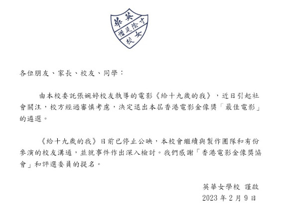 在英華女學校的聲明裡,指校方在經過審考慮後,決定退出香港電影金像獎最佳電影的遴選。至於最佳電影的提名,導演之一的郭偉倫表示會繼續角逐最佳導演的獎項,而另一導演張婉婷則對郭導予以尊重,惟張導將不會上台領獎。而郭偉倫與陳序慶則角逐最佳剪接。