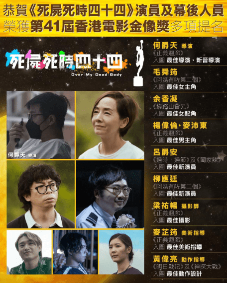 上圖所見,便是天下一發行、錢小蕙監製、何爵天執導的黑色幽默電影《死屍死時四十四》的最新宣傳,當中主要是恭賀一眾參與此片的演員及幕後人員獲得第四十一屆香港電影金像獎提名,當中包括最佳導演與新晉導演提名何爵天、最佳女主角提名毛舜筠、最佳男主角提名楊偉倫與麥沛東、最佳女配角提名余香凝、最佳新演員提名呂爵安與柳應廷、最佳攝影提名梁祐暢、最佳美術指導提名麥芷筠與最佳動作設計提名黃偉亮。