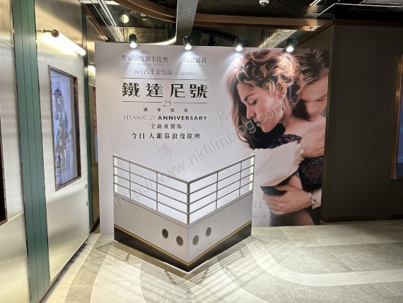 迪士尼發行、占士金馬倫執導的《鐵達尼號》適逢廿五周年紀念,迪士尼發行於上周四起安排這部片長逾三小時的電影在香港推出全新重製版。而上圖所見,則是「講。鏟。片」情報人員於上周在尖沙咀iSquare英皇戲院所攝,可以看到宣傳紙板的前方,還有一個類似「鐵達尼號」船頭的宣傳裝置,可以供觀眾拍攝。