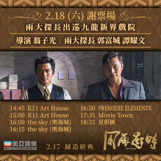 《風再起時》是導演翁子光繼《踏血尋梅》後的新作,以六十年代貪污橫行的時代為背景,將焦點放在梁朝偉與郭富城身上。有意與導演或演員交流的觀眾,敬請把握是次機會從速購票好了。