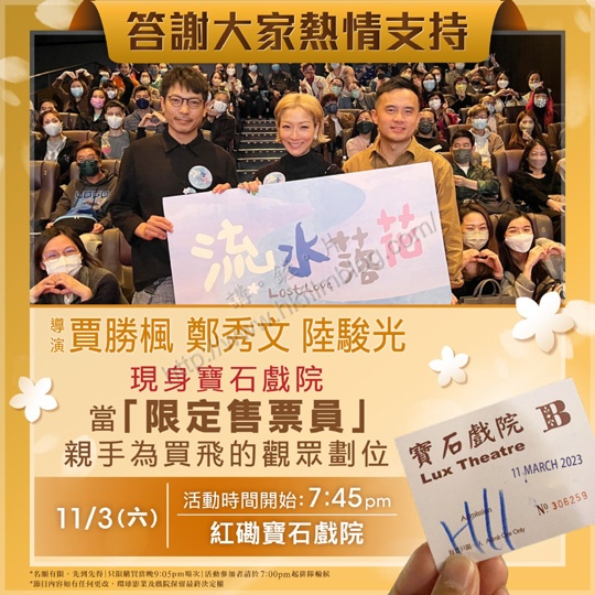 上圖所見,便是電影《流水落花》在其官方Facebook專頁的公佈,指出為了答謝觀眾對電影的熱情支持,導演賈勝楓將聯同演員鄭秀文與陸駿光,將於本周末晚上七時四十五分,假紅磡寶石戲院當「限定售票員」,為購票的觀眾劃位。