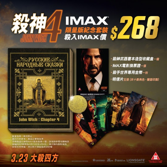 上圖所見,便是MCL院線的通告,當中指洲立與東方影業發行的《殺神John Wick 4》將於三月廿三日開畫,特別為該片推出IMAX限量版紀念套裝。當中包括了「殺神武器書本造型收藏盒」一個、IMAX電影換票證一張、殺手世界專用金幣一枚及明信片一套。