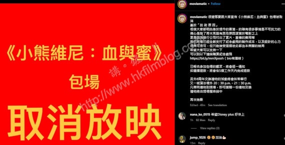 然而,就在今天傍晚,「電影療傷誌」在其Instagram帳戶宣佈,原安排舉行的《小熊維尼:血與蜜》的包場被取消。而原本已預售的戲院,也停止了發售該片的戲票。而在截稿前,VII Pillars並未在社交媒體有進一步公佈。到底一部還有三天上映的電影,在一天之間到底發生甚麼事?