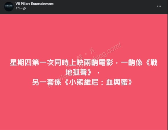 直至今天早上,VII Pillars在其Facebook專頁仍聲稱該公司在本周四同時上映兩部電影,一部是跟寰宇聯合發行的《戰地孤聲》,另一部則是《小熊維尼:血與蜜》。
