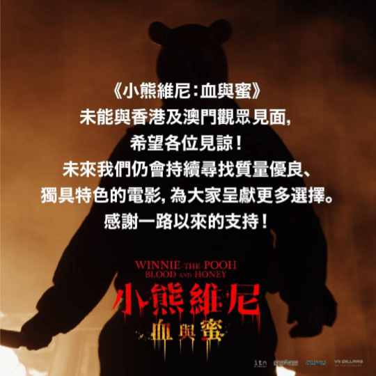 在VII Pillars發行在其官方Facebook指出,原定於後天上映的《小熊維尼:血與蜜》將取消在香港與澳門上映,也希望觀眾見諒。而發行公司亦表示日後仍會持續尋找質量優良及獨具特色的電影上映。
