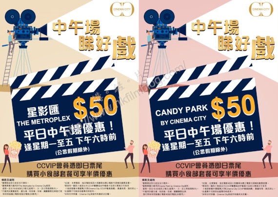 與此冋時,Cinema City VIP會員慼即日票尾,更可以在購買小食套餐時享有半價優惠。看來如斯的策略,明顯地是希望觀眾能到這兩家相對與港鐵站距離較遠的戲院,並增加這兩家戲院平日的票房。
