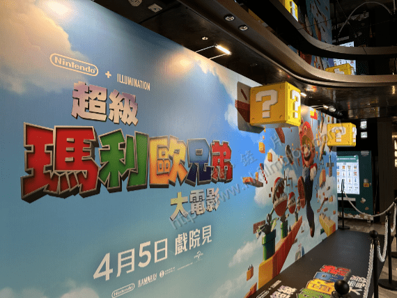 上圖所見,便是「講。鏟。片」情報人員日前於尖沙咀iSquare英皇戲院八樓大堂所攝。在戲院連接IMAX影院扶梯與小食部的位置,擺放了環球發行、將於四月五日上映的《超級瑪利歐兄弟大電影》的電影宣傳,可以看到其背後的佈景已估了相當大的位置。
