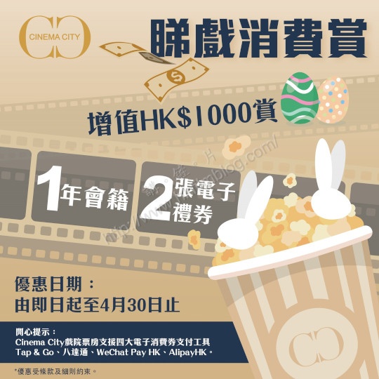 上圖所見,便是Cinema City推出的優惠,優惠以「睇戲消費賞」為名,觀眾在其院線電子平台增值港幣一千元的話,便可以享有一年會籍與兩張電子禮券。而有關優惠由即日起至四月三十日為止。