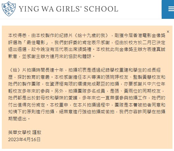據英華女學校的聲明,校方感謝香港電影金像獎的評案的肯定,惟昨晚沒有派出代表出席頒獎禮,亦感謝主辦單位的協助與體諒。與此同時,校方亦再次強調有關的拍攝情況。當中重申在《給十九歲的我》拍攝過程中,團隊本著被拍者同意和知情下的厬則進行拍攝,絕無意進行強迫拍攝或偷拍,亦容許同學在拍攝期間退出。