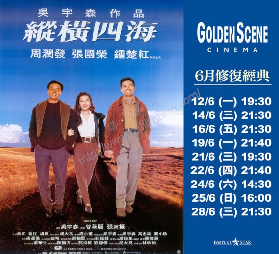 上圖所見,便是吳宇森執導,周潤發、張國榮與鍾楚紅主演的《縱橫四海》,高先電影院將會安排於六月在其戲院放映修復版本,合共初步提供九場放映,映期由六月十二日至六月廿八日,而上圖亦同時列出了放映時間,而各場門票亦已於高先電影院票房、戲院網站與手機應用程式發售,而網上購票亦不設手續費。