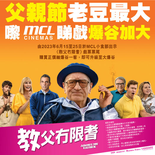 上圖所見,便是MCL院線推出的最新優惠。觀眾於六月十五日至二十五日期間,到MCL院線旗下戲院的小食部出示洲立發行於明天上映電影《教父冇限耆》的戲票票尾,在購買正價細爆谷一客時,便可以升級至大爆谷。