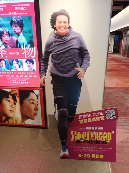 上圖所見,便是「講。鏟。片」情報人員日前於九龍站圓方商場Premiere Elements戲院大堂所攝,可以看到其中一角擺放了電影《別叫我賭神》的宣傳紙或牌。紙牌看到男主角周潤發穿上運動服裝跑步的樣子。而下方還有二維碼,殫以讓觀眾掃瞄二維万拌,並且於下方寫上「6.29再起跑」確定映期。