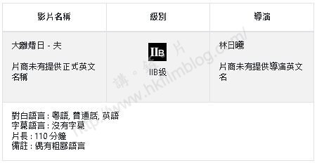 上圖所見,便是負責電影檢查的「電影、報刊及物品管理辦事處」的電影檢查結果記錄,可以看到出現了《大離婚日─夫》的送檢記錄。當中對白語言包括粵語、普通話與英語,並沒有提供字幕,片長為一百一十分鐘,並且因為偶有粗鄙語言而被評為青少年與兒童不宜的II B級別,而導演則為林日曦。