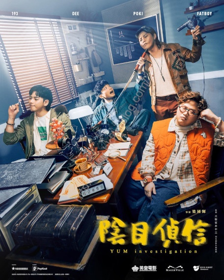 上圖所見,便是電影《陰目偵信》的初版海報,海報看到四位主角都在海報當中,當中郭嘉駿拿著珍寶珠、何啟華拿著劍、吳保錡拿著風筒,而梁業則是睡著。檯面看到不同類型的工具,從風扇、相機到符咒也有。可以說是私家偵探與靈異用品兼備。