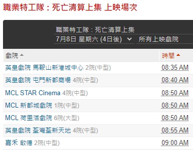據了解,洲立發行讓戲院可於該天早上八時起放映《職業特工隊:死亡清算上集》。不過畢竟現時戲院的人手仍算是短缺,故此戲院也不太想過早推出場次,以免影響員工的編排及其他相關成本,且看最終有沒有戲院推出更早的場次好了。
