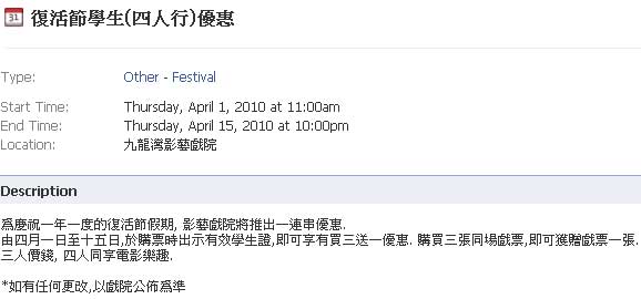 上圖所見,便是影藝戲院在其社交網站Facebook發出的復活節優惠通告,只要於四月一日至四月十五日期間出示有效學生證的話,購買三張同場戲票,同可獲贈戲票一張,亦即是買三送一。有關優惠只限學生適用。