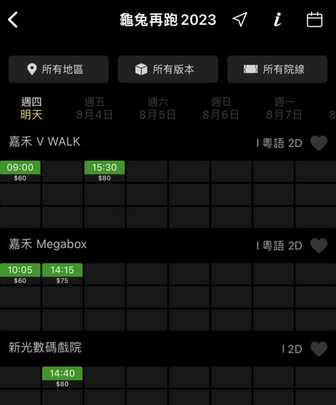 可是,觀乎電影應用程式Movie6顯示的資料,《龜兔再跑2023》於明天只安排於南昌站嘉禾V Walk、九龍灣嘉禾MegaBox及北角新光戲碼戲院合共上映五場,其中兩場是早上九時及十時零五分的早場,其餘三場則是下午二時十五分至下午三時半的下午場,意味著該片首天於晚上並無任何場次。除此以外,青衣城影藝戲院首天亦放映早上九時的早場。