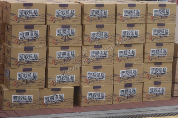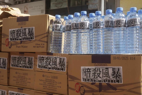現場擺放了數十箱的樽裝水,並在包裝外貼上了電影《暗殺風暴》的貼紙。