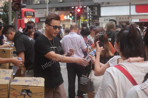 而工作人員在派水前,也會為每樽水貼上電影《暗殺風暴》的貼紙。