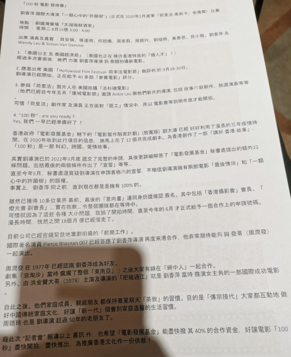 觀乎新聞稿一整頁,當中四分之一就是談跟《100秒》內容無關的好友介紹,然後四分之一就是談與電影基金申請不愉快經理,還有幾段是劉導的豐功偉績。看起來單是新聞稿,相信劉導未開拍已經來了高潮吧!