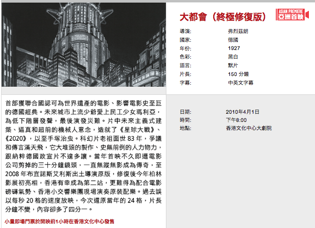 今屆香港國際電影節的特備節目:《大都會》終極修復版已於四月一日假香港文化中心舉行亞洲首映。該晚的播放,也許有著天堂與地獄的感覺。