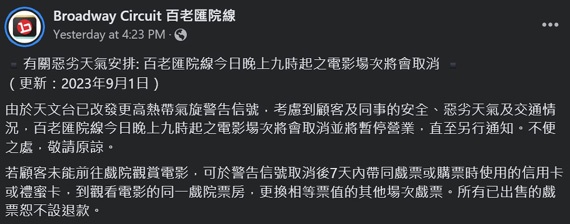 上圖所見,便是百老匯院線的最新通告。當中指出考慮到觀眾與同事安全,該院線將會取消今晚晚上九時起的場次,並直至另行通知。估計也許要待天文台改發八號或以下熱帶氣旋警告時,才有望重開。