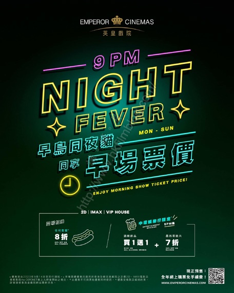 上圖所見,便是英皇戲院最新推廣的優惠。當中在票價方面,自九月十四日起將香港全線的英皇戲院提供夜場優惠,晚上九時後開始的場次將可享有跟早場相關的優惠票價,而且有關的優惠可直至另行通知。
