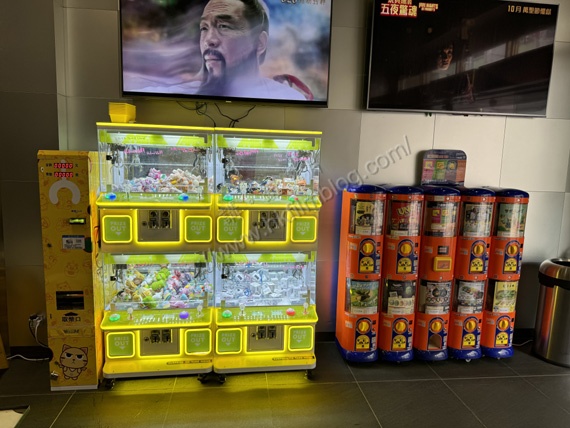 上圖所見,便是「講。鏟。片」情報人員日前於屯門巴黎倫敦紐約米蘭戲院大堂所攝,可以看到戲院大堂右方的一邊放置了一組扭蛋機。不過在旁邊卻可以看設有四台公仔機。而夾公司不是直接以硬幣來玩,觀眾需要先到左方以紙幣換來代幣才可以來夾公仔。