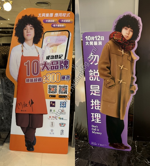 當中左方其實是在一家連鎖食肆所拍,當中以其圍裙的造型來宣傳相關集團的品牌,並且以宣傳相關的優惠。至於右方,才是安樂發行、剛於十月十二日開畫由日劇改編電影《勿說是推理》的宣傳。不過,香港的天氣明顯較日本炎熱,看來左方的人物曾比特要學右方菅田將暉穿上厚衣還要戴上頸巾來拍照的話,也許也會感到相當辛苦的吧!故此,對於菅田將暉的電影宣傳品,也要認明正身啊!