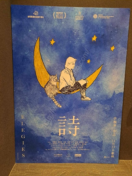 卡士有限公司及喜鵲媒體有限公司出品及製作、高先發行、許鞍華執導的紀錄片《詩》將於十一月二十三日上映。而上圖所見,則是「講。鏟。片」情報人員於昨天在堅尼地城高先電影院大堂所攝。可以看到《詩》的宣傳紙板以手繪畫的形式出現。在藍色的夜空裡,一個人個一隻貓坐在月亮上,身邊還有一些星星。