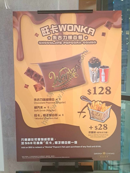 上圖所見,便是「講。鏟。片」情報人員日前於其中一家英皇戲院所攝,可以看到英皇戲院因應電影《旺卡》上映推出朱古力爆谷餐。套餐包括了朱古力味細爆谷一客、細汽水一杯及《旺卡》帽子爆谷筒一個,套餐餐承惠港幣一百二十八元,同時也可以再加二十八元來加購炸薯條配朱古力醬一客。