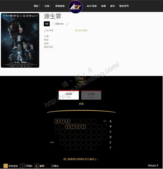 上圖所見,便是來自ACX Cinemas官方網站的截圖,可以看到該戲院於今天晚上安排了兩場《源生罪》在該戲院三院放映,兩場場次分別為晚上七時正及晚上九時二十分。而每場均有少量座位公開發售。